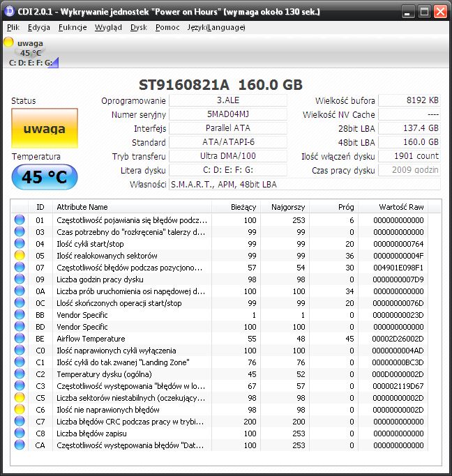 Bo tu masz wartosci raw, ktore trzeba przeliczyc na liczby,bo tylko to sie liczy.Ale ogolnie 4F to 79 wiec jest zle. Tak samo jak te dwie pozostale zolte wartosci (2d=45). Plus ogromna ilosc bledu przy pozycjonowaniu (glowicy?). |