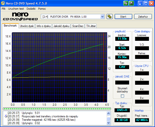 ![]() http://www.plextor.pl/pl/products/idp=64 ![]() Verbatim +Rx16 palony 16x Plextor PX-800A 1.00 ![]() ![]() ![]() ![]() ![]() Jest dobrze.... ![]() ![]() Dla por***243;wnania Verbatim +Rx16 palony 16x na Pioneer 112@A12J http://forum.cdrinfo.pl/showpost.php...&postcount=343 Pierwsze wra***380;enia.... Nap***281;d do z***322;udzenia przypomina Optiarc AD-7170-73A. OEM Optiarc AD-7170 (brak LabelFlash) Pr***243;ba zrobienia kopii firmware Binflash'em 1.39 dla Nec - Optiarc zako***324;czona sukcesem. Przy pierwszej pr***243;bie bez skanowania Binflash pokaza***322; Nec AD-7170 0.08. Po skanowaniu pokazuje Plextor PX-800A. Jest cichy por***243;wnywalny na przy zapisie i odczycie 16x do zapisu 6x Pionieera 112.Korekcja s***322;aba.... nie rozpozna***322; p***322;ytki DVD do testu korekcji.Tacka czarna, wysuwa si***281; cicho i p***322;ynnie.