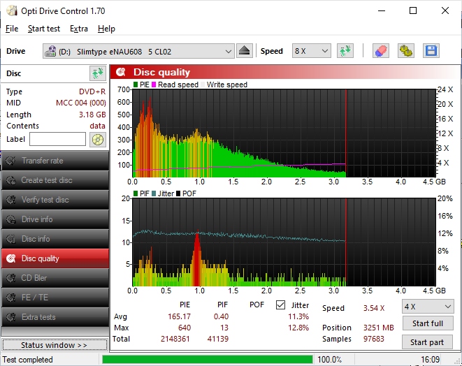It is a fake Princo DVD-R media, fake and interesting for three reasons. It is not made by Princo, which hasn't been making optical media for a few years, nor by Umedisc, which bought the Princo technology and trademark and offers "official" Princo media. It is made by one of the few remaining smaller and (as yet unknown to me) Chinese manufacturers. Secondly, it doesn't even have a Princo MID code, but a fake Mitsubishi Chemicals code. Third, it's not even just a DVD-R, but a DVD+R. ![]() I'm attaching an informative test on a drive that is not ideal for testing, but 10+ years ago, when I was heavily into CD and DVD media testing, it gave at least very roughly comparable results to Benq and Plextor drives. I have the drives to test (Benq, Plextor, LiteON), but I can't find an IDE/SATA to USB converter at the moment. If I find one, I will complete the tests with a proper drive. The data was burned with the same drive (Lite-On eNAU608 5 CL02) at 8x speed. |