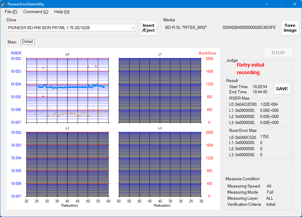 The same media in the JVC edition JVC BD-R 25GB 6X ARCHIVAL PRINTABLE WATERPROOF PHOTO GLOSS Pioneer BDR-PR1 ML fw.1.75 AnyBurn 6.6 x 4 ![]()