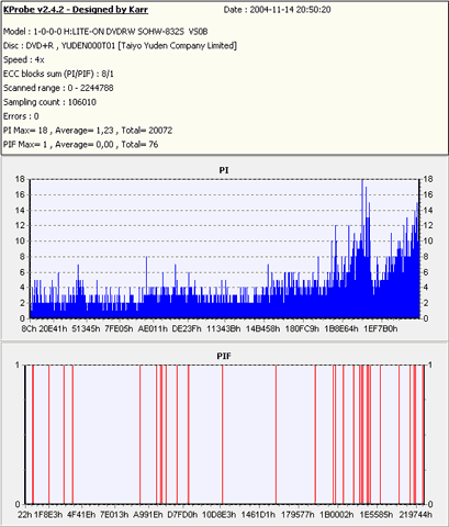 moj 2 litek 812 ze stycznia po modzie na 832 wypalil tak Verbatim DVD+R DL TU jest screen z KProbe postanowilem sprawdzic jak plytka wyjdzie w PlexTools i oto wynik :) |