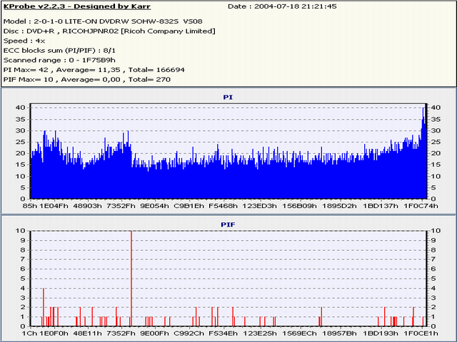 Standard ilości błędów ustalono przy założeniu odczytu płyty z prędkością 1x. Niestety, taki przeprowadzony test trwa stanowczo za długo, więc przyjeło się używać prędkości 4x a same kryteria jakości przenieść bez zmian. Ustawiamy więc wartość 4x. Ostatnio zmieniany przez mensir67pl : 21.07.2004 o godz. 16:51 |