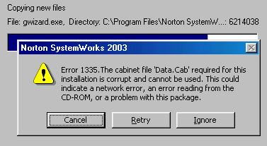 Mam problem z zainstalowaniem Norton SystemWorks 2003 pro, otóż przy instalacji wyskakuje mi błąd z plikiem Data.cab, który ma coś koło 47 Mb. Nortona zassałem z Kazaa, czy ktoś wie, skąd mogę ściągnąć ten plik? Dołączam zrzut ekranu.
