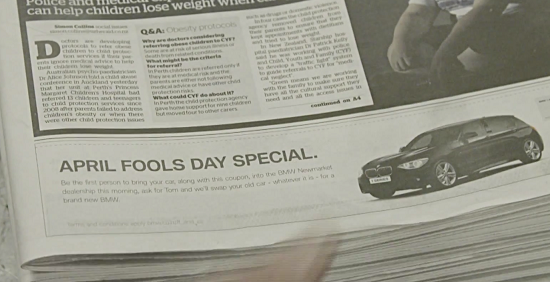 Anty Prima Aprilis w Nowej Zelandii. Dealer BMW ogłosił w lokalnej gazecie że ten kto pierwszy się tego dnia pojawi w salonie i spyta o niejakiego Tom'a, ten wymieni swój stary samochód (marka i stan obojętne) na nowiutką beemkę. :D