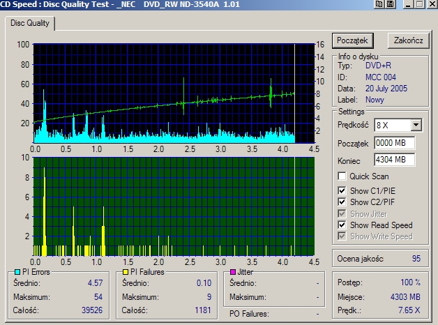 Z wykresu wynika, iż testowana płytka jest wypalona z nierównomiernymi błędami PI i małą ilością błędów PIF. Mała ilość błędów PIF świadczy o dobrej jakości wypalonej płytki zakładając poprawny Jitter. Ale to nie do końca pełny test. Prośba o zrobienie testu tej samej płytki przy ECC 8/8 i prędkości 8x. Ponadto i nie jest to wina Kolegi nie dowiemy się o błędach Jitter. Wiemy na pewno jakie występują błędy PI/PIF przy ustawieniach ECC 8/1 i prędkości 4x. Odczytujemy płytki z prędkością 8x (rzeczywista prędkość). Dlatego prośba o ponowny test. :taktak: i zmianę KProbe na 2.4.2(3). A przy okazji opisywanego wykresu zadam pytanie. Dlaczego tak nierównomiernie wypalona płytka ? Ponieważ wykres ukazuje się różnie zrobiłem kopie. :) |