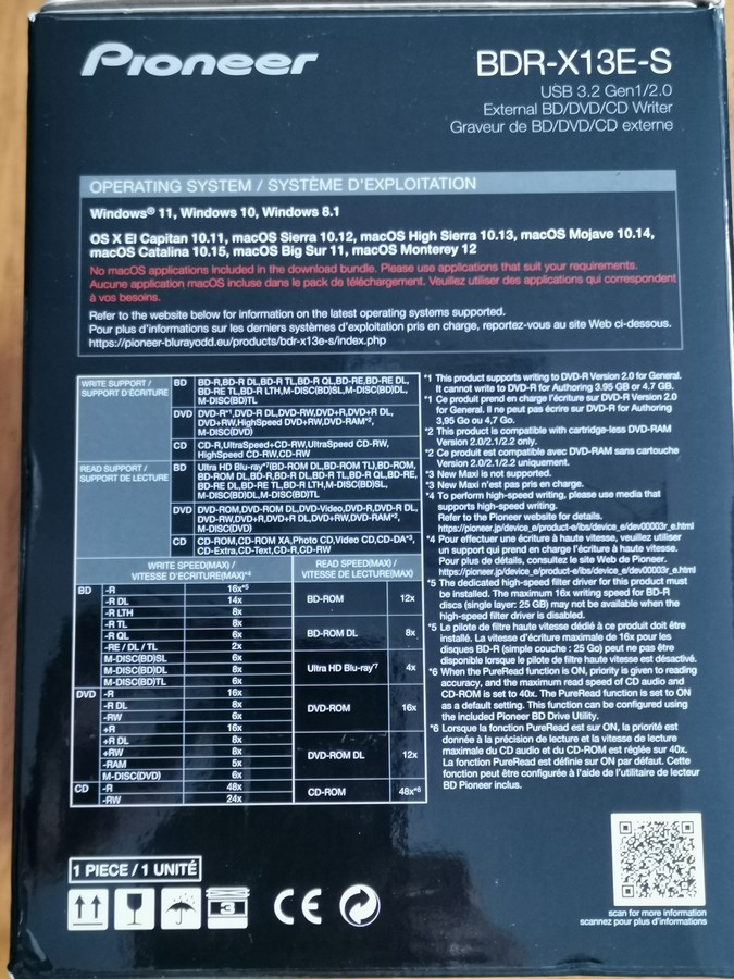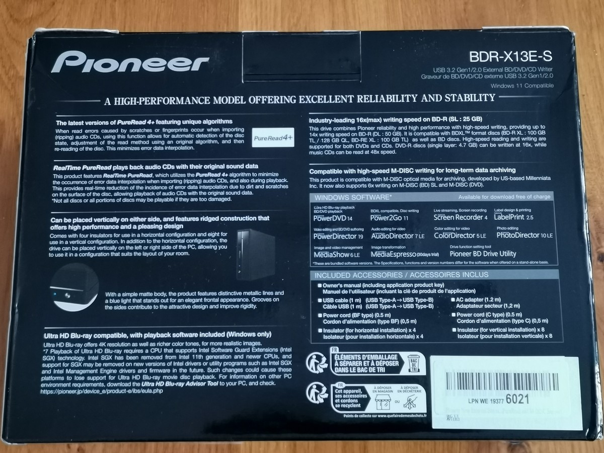 Pioneer wprowadził po "cichu" na rynek japoński dwa nowe modele zewnętrzne USB 3.2 Pioneer BDR-X13JBKD / BDR-X13J-SD z obsługą DM for Archive. Na firmowej stronie producenta nie ma żadnych wzmianek ani informacji o tym . Napędy posiadają datę produkcji -koniec 2024r. Pakowane w BOX firmowy z uniwersalnym porządnym zasilaczem o zakresie napięcia 100V-240V 3.0A 36W oraz dołączoną jedną płytą Pioneer BDR-25GB DM for Archive. Załącznik 212668 Załącznik 212669 |