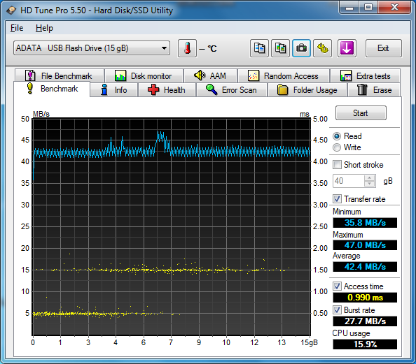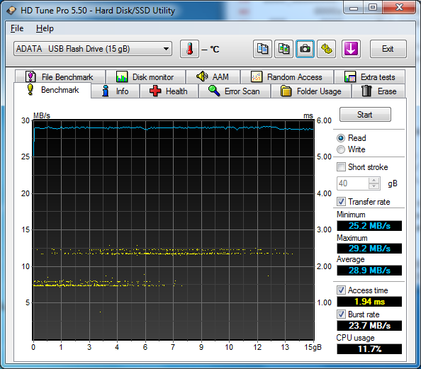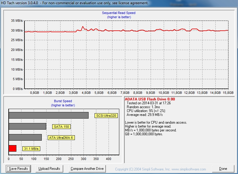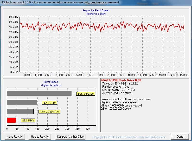 ADATA DashDrive UV150 16GB Parametry: Odczyt: 90MB/s Zapis: 20MB/s Koszt: ~29zł + kw Testy USB 2.0: Testy USB 3.0: |