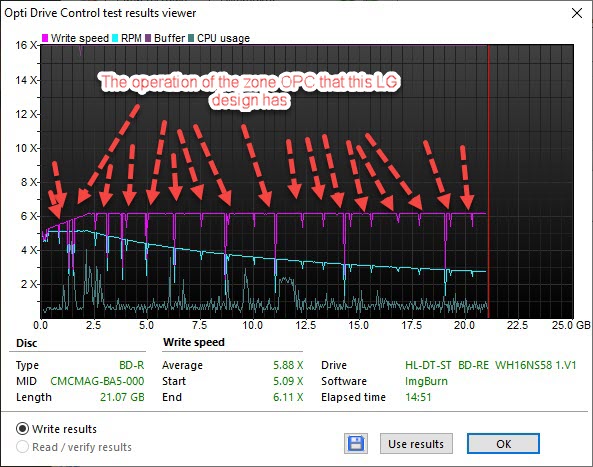 If the external calculator in Imgburn is enabled or disabled, it has no effect on the drive. Disabling OPC for the drive would require extensive modifications to the drive's firmware. The LG NVC:50/51/55/58 models, like all LG models, have zoned OPC, which is always active, as seen on every write run. OPC checks the error rate multiple times every few zones via the ERC block and corrects the laser power and beam. VinPower models definitely have different OPC settings than factory LG models, and the same applies to the VinPower Pioneer BDR-209DBK Plus / BDR-212V.