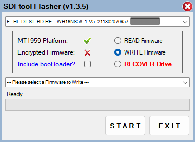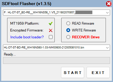 This firmware fixes issues of ASUS stock firmware (i.e. not writing some disks, hanging the controller, etc), sleep bug, and opens door for disks not supported to write before (i.e. I could only write to RITEK/DR3 aka TDK BD-R DL 50GB on Pioneer now ASUS/LG writes too)! SDFTool is awesome because it allows crossflashing even encrypted burners and rollback / rescue broken drives, works out of the box on 64-bit OS, supports all sorts of drives.. and is not detected as malware unlike most other tools ;-) After flashing power off / on is required, then old ASUS BW-16D1HT 3.10 reports as HL-DT-ST BD-RE WH16NS60 1.03 :-) Big Thank You @jadburner and @czary2mary !! Good to see someone still cares about CeDeROMs :D :D Cytat: