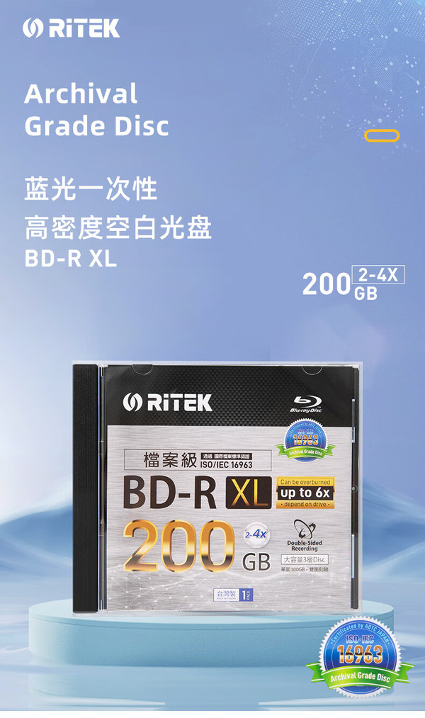 Ritek wprowadził na rynek dwustronny (2 x 100GB) nośnik BD-R XL 200GB również w wersji Archival Grade Disc z certyfikatem ISO IEC 16963 -nośniki z takim certyfikatem produkowane są w najnowszych technologiach na najlepszych odczynnikach i najnowszych maszynach tłoczących .Producent szacuje trwałość nośnika na 50lat . Na dziś nośnik dostępny na rynku chińskim i japońskim Załącznik 212873 Załącznik 212874 Załącznik 212875 |